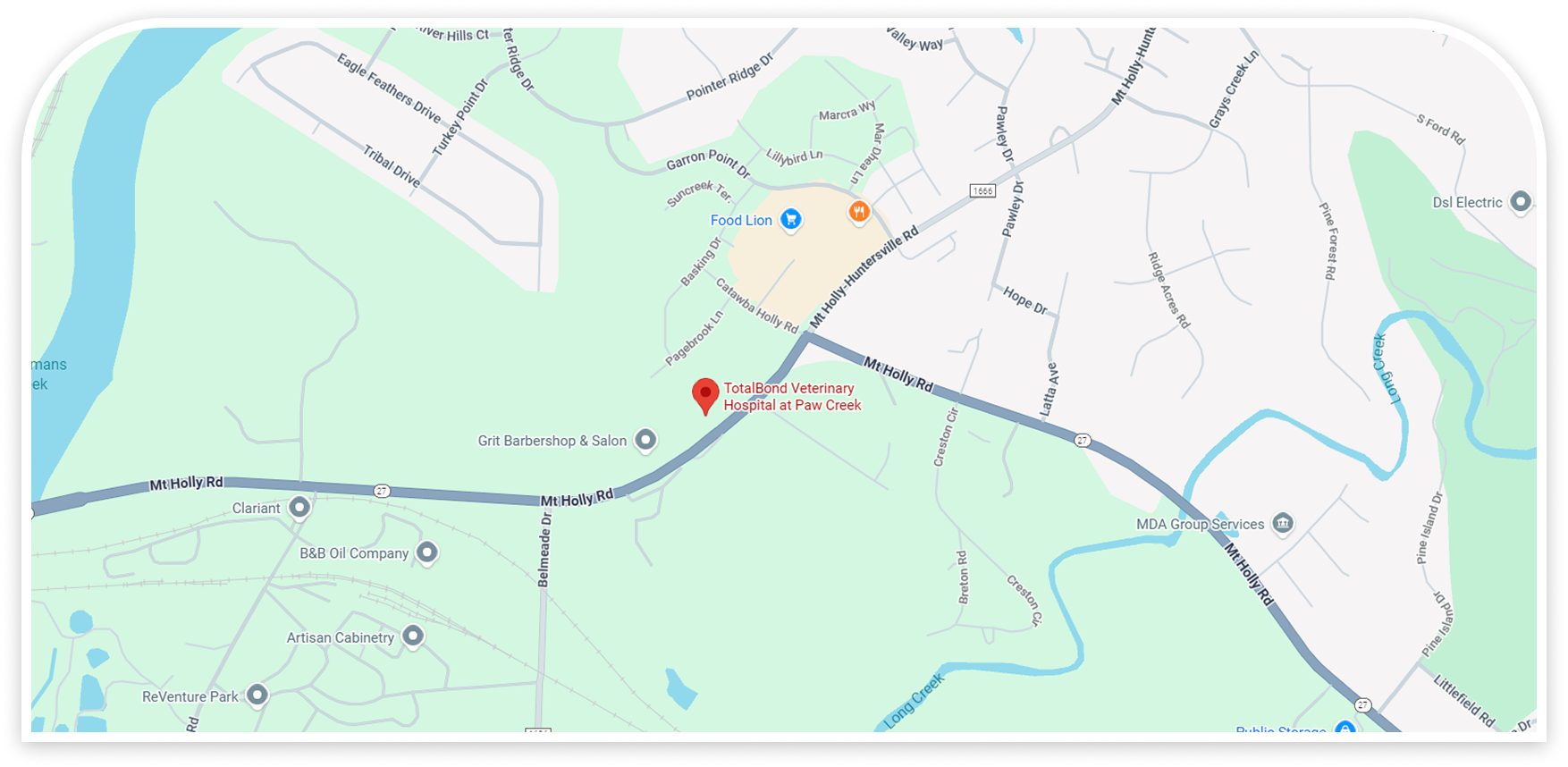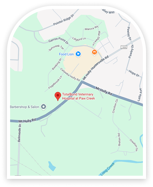 TotalBond Veterinary Hospital at Paw Creek is a full-service veterinary practice that has been proudly serving the dogs and cats of Charlotte and their owners in a warm and welcoming environment, providing a vast array of veterinary services in our modern, fully-equipped facility for all of your pets' needs.